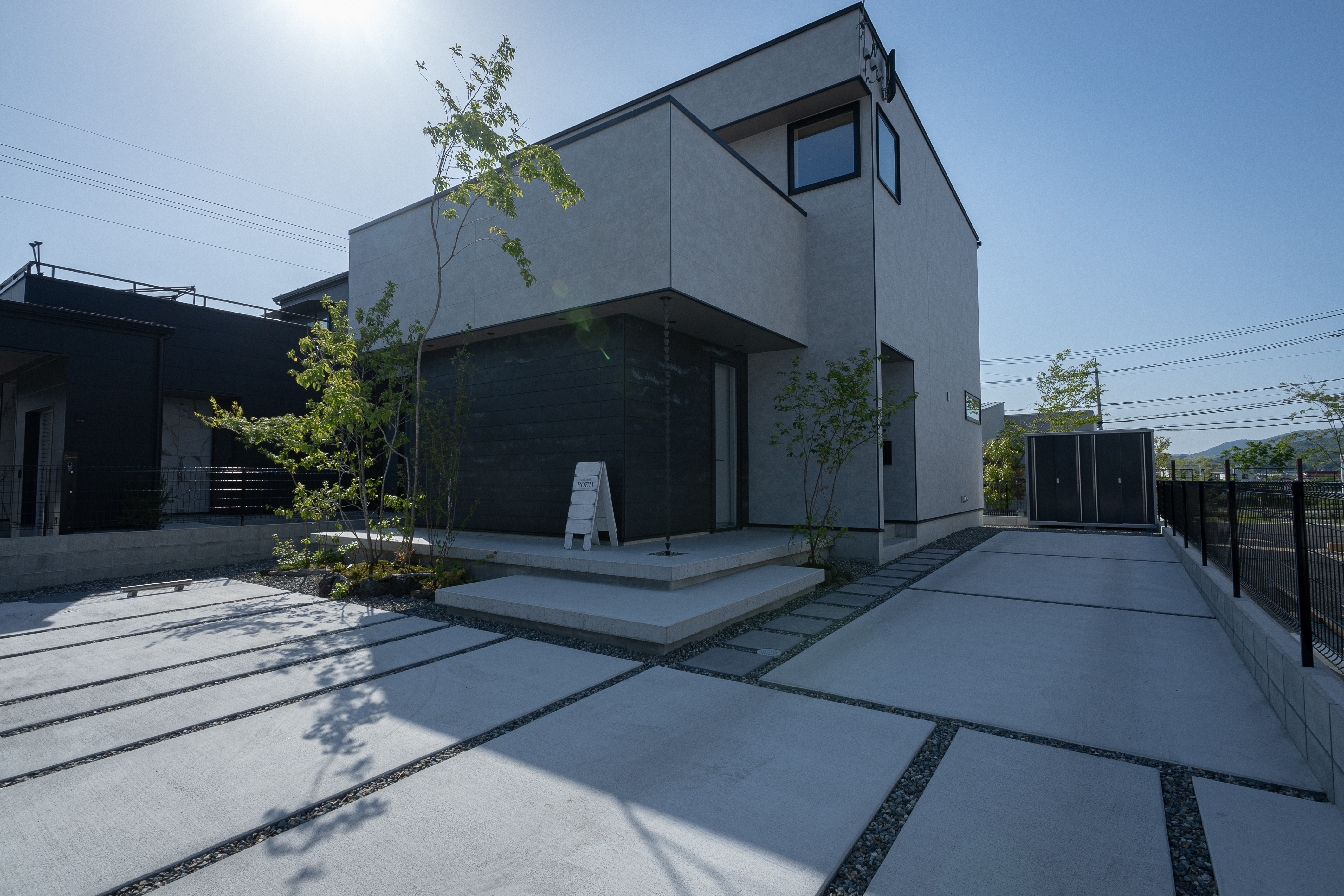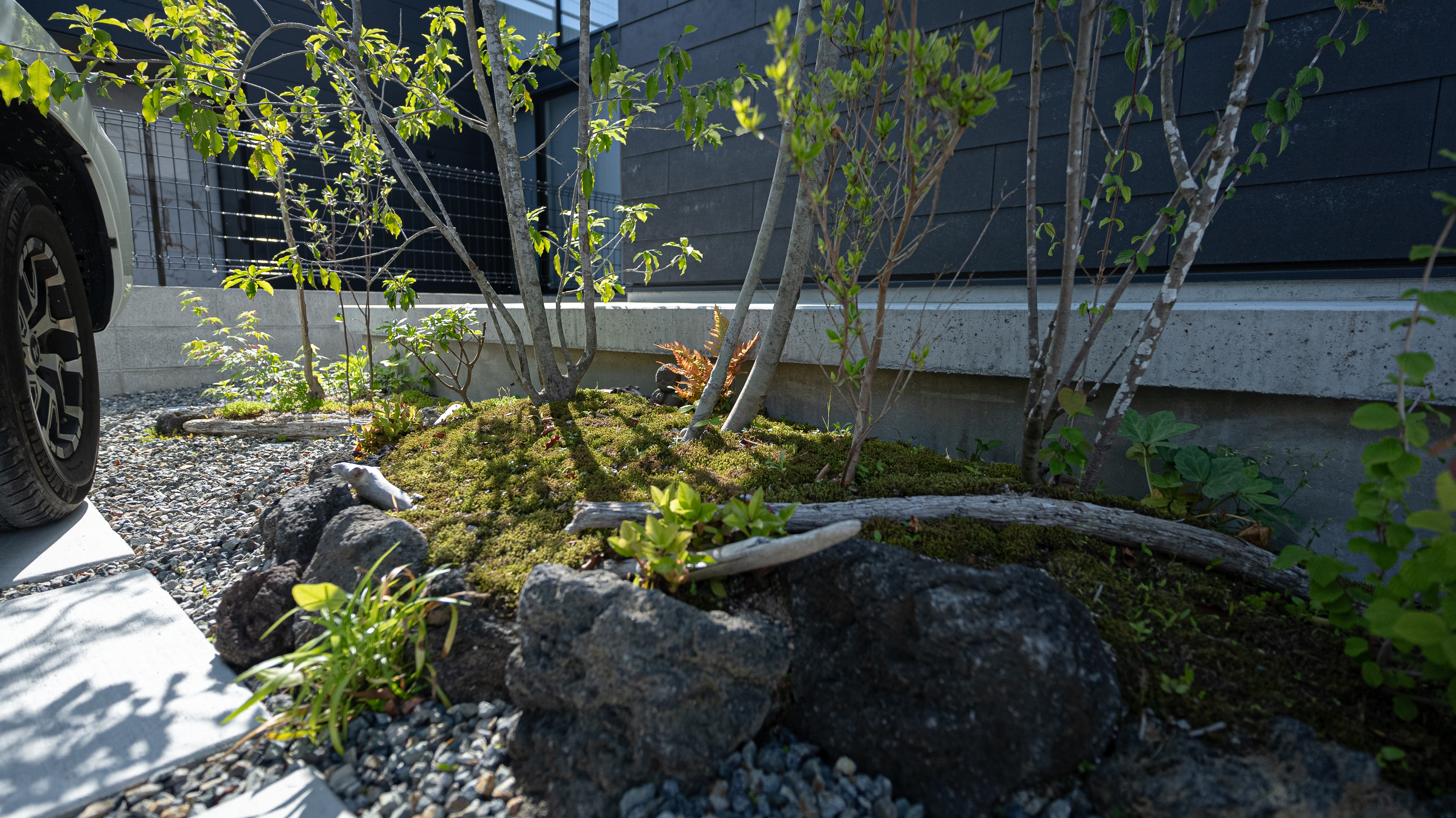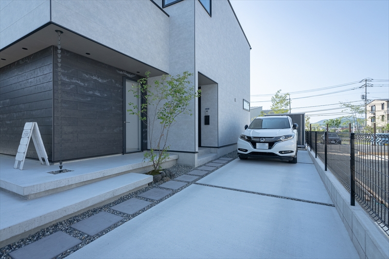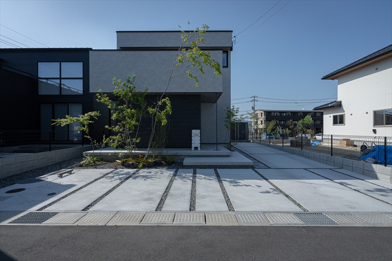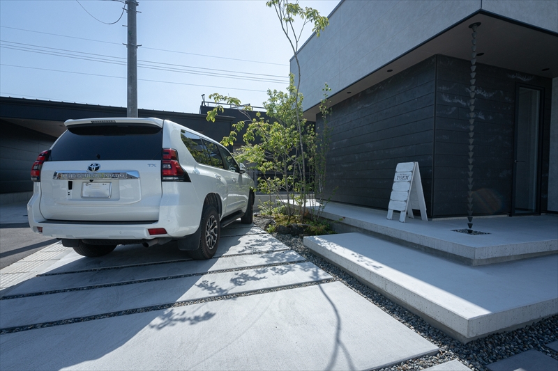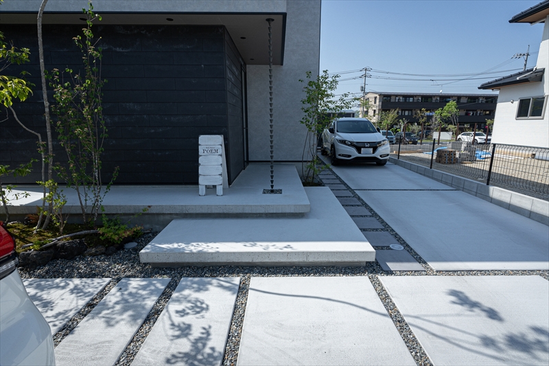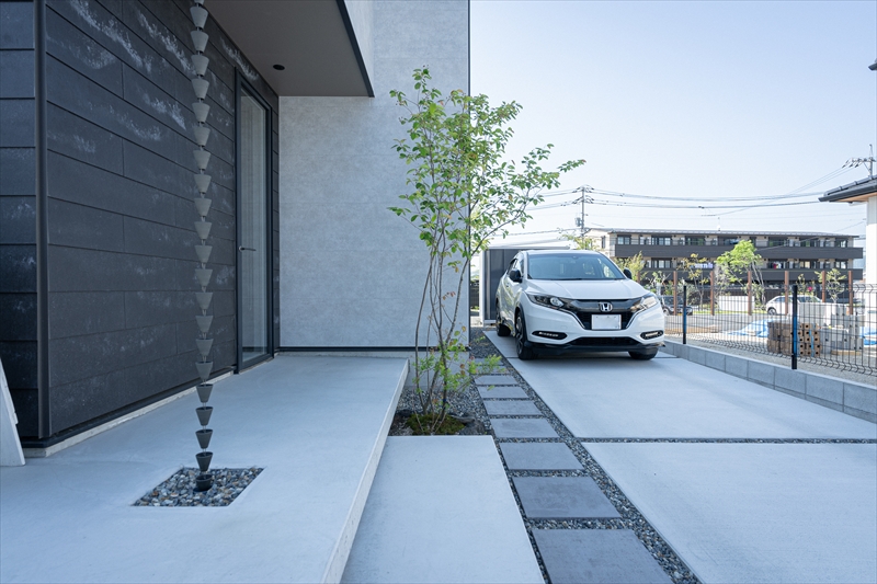 コンクリートの平板は自宅へと続きますが、途中に高木をいれることで、