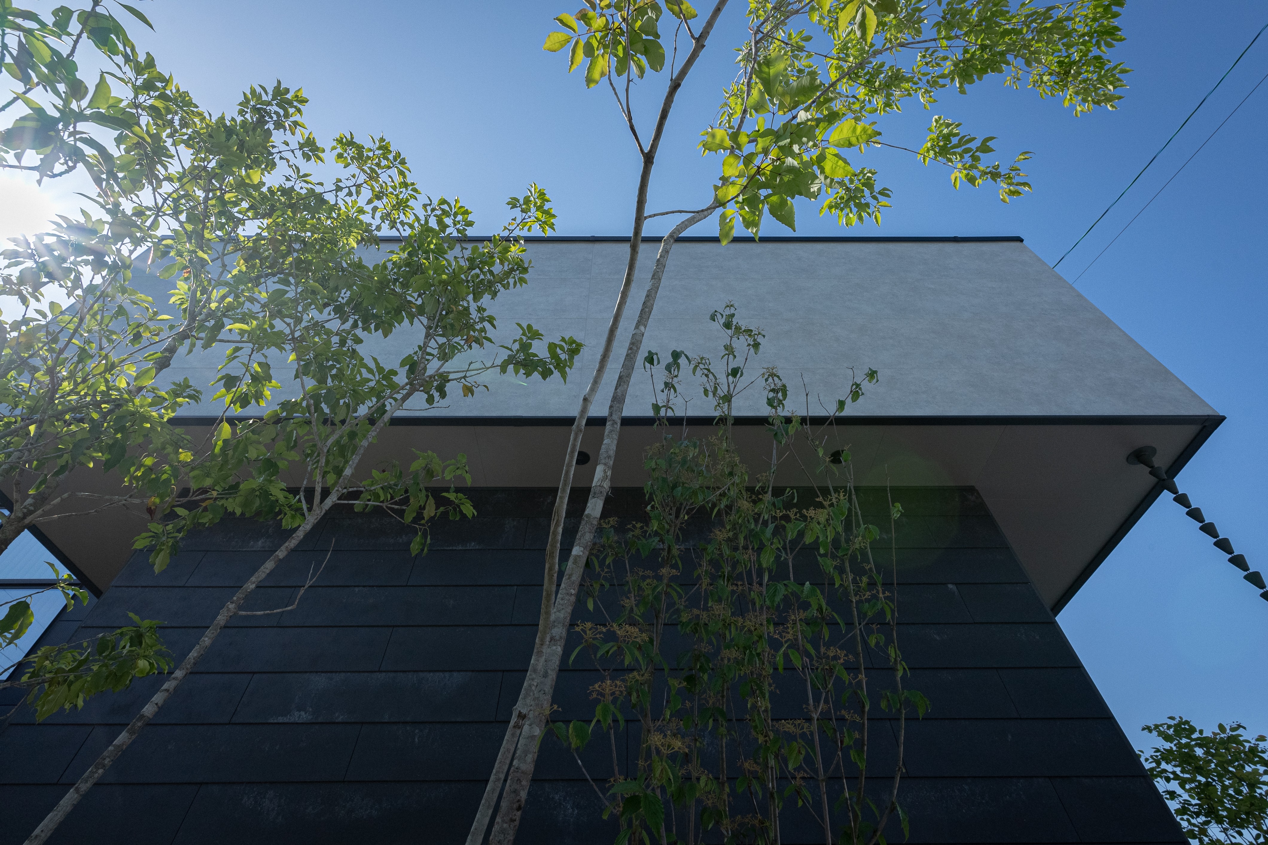 建物の横ラインと対比でガレージはコンクリートで縦ラインをつくり、