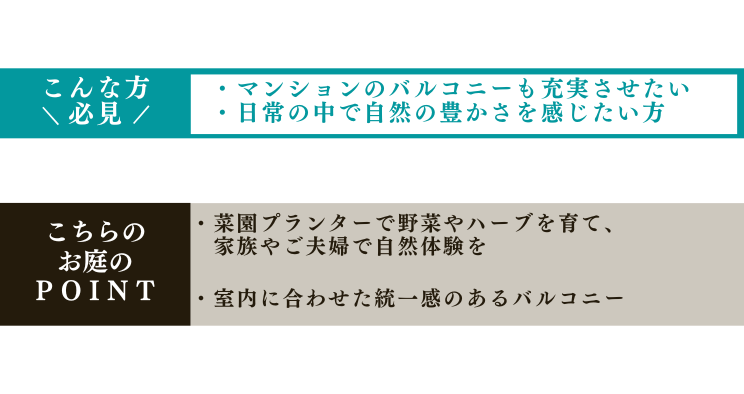 お部屋の設備や家具のイメージに合わせたベランダのご提案をすることで部屋からベランダへの一体感、