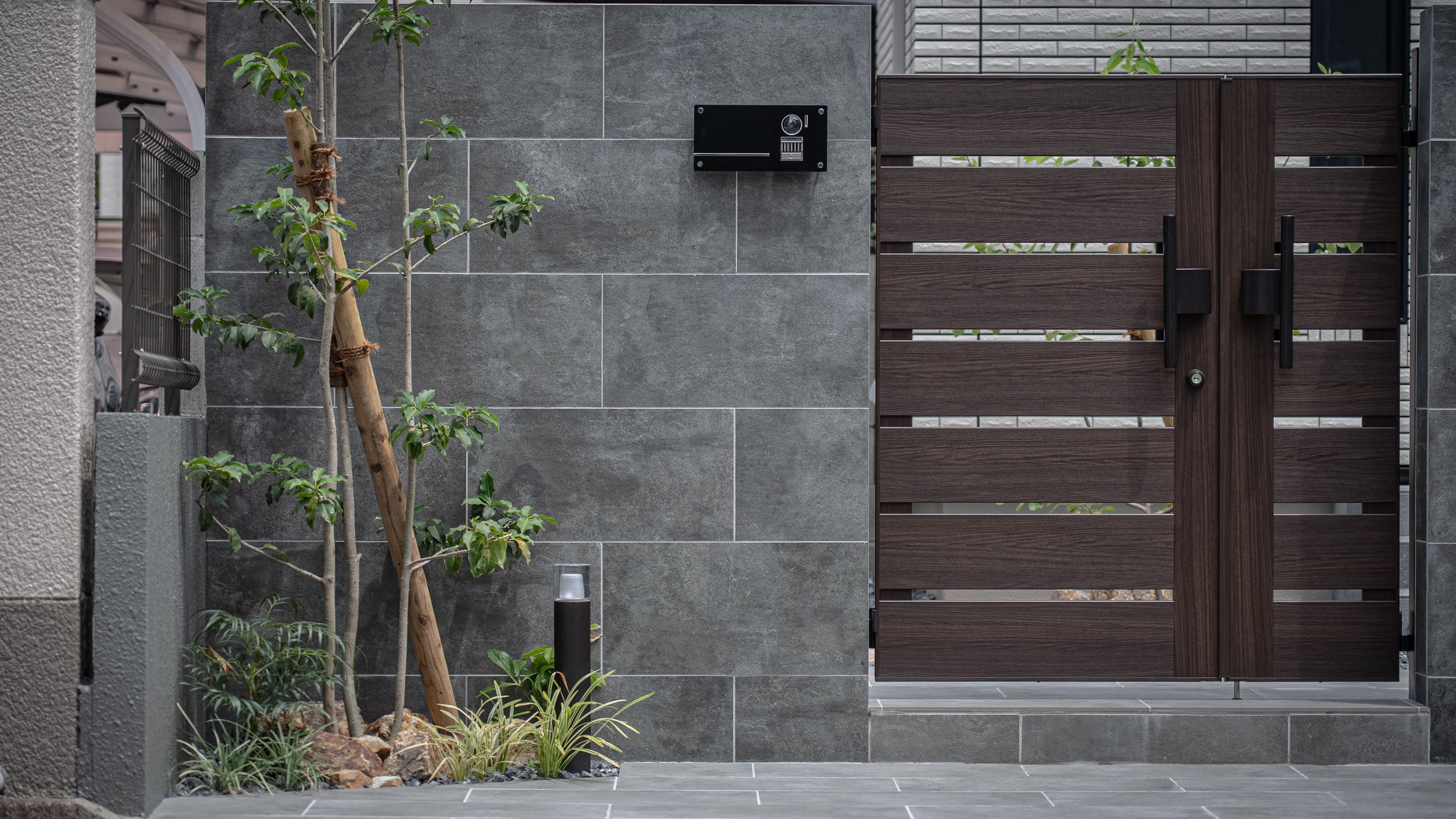 グレー中心のファサードにブラウンのゲートが入ることでより重厚感がでます。