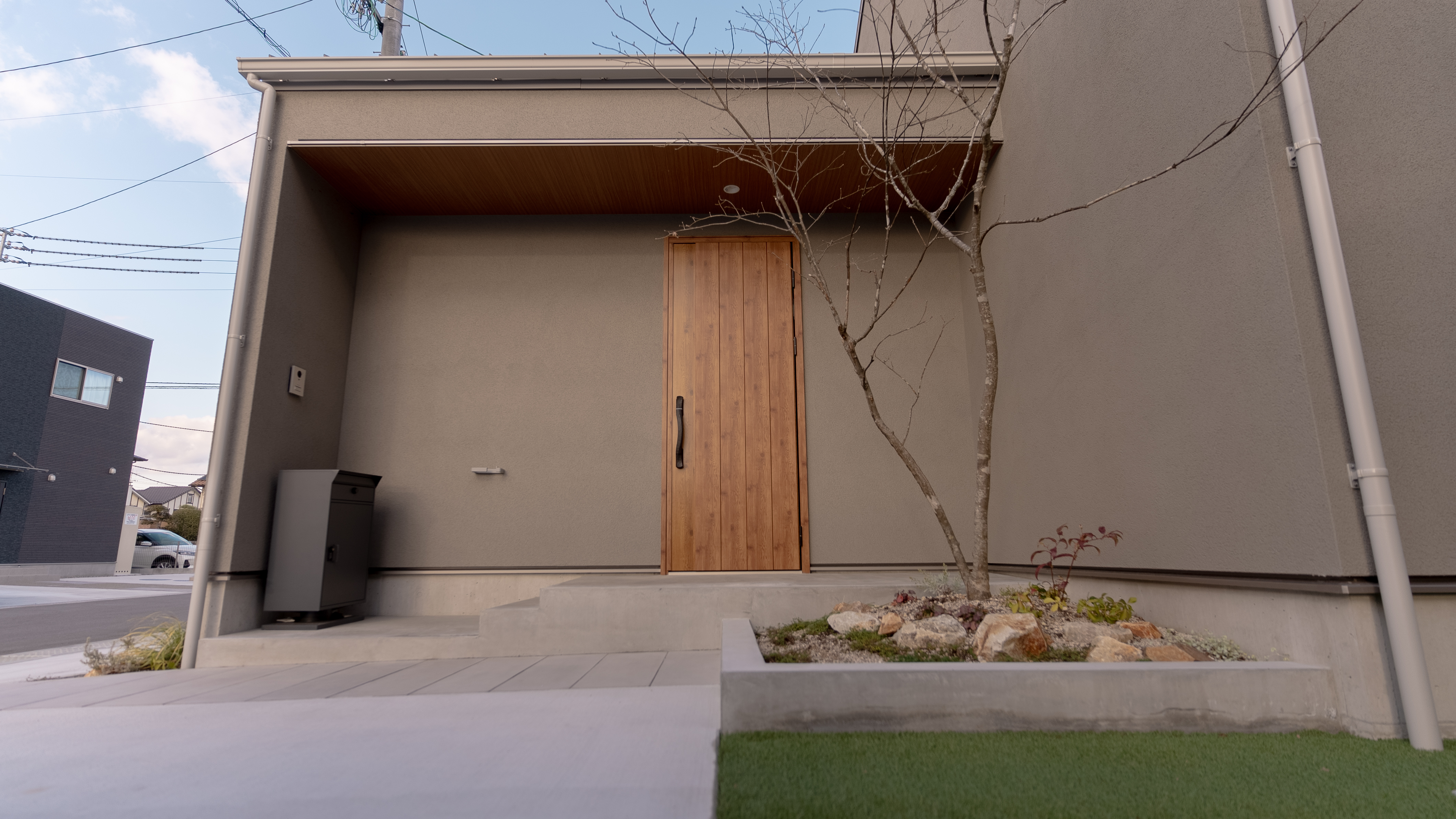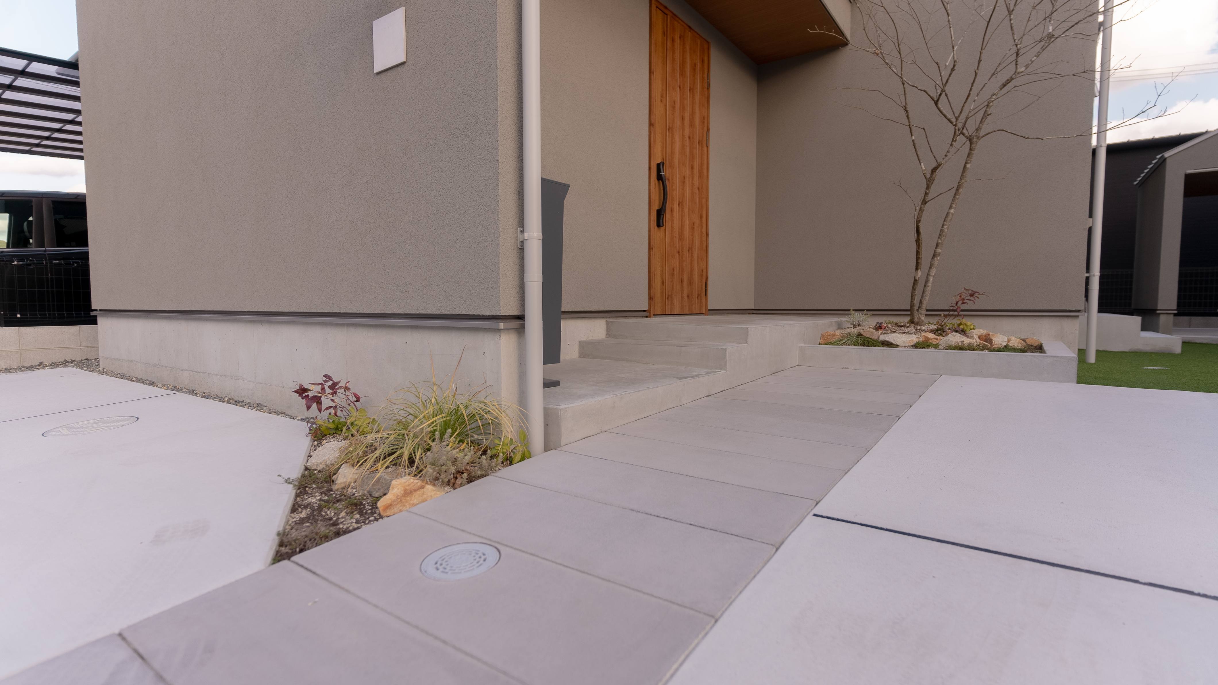 玄関前の統一感も持たせつつ、視覚効果も表現しています♬