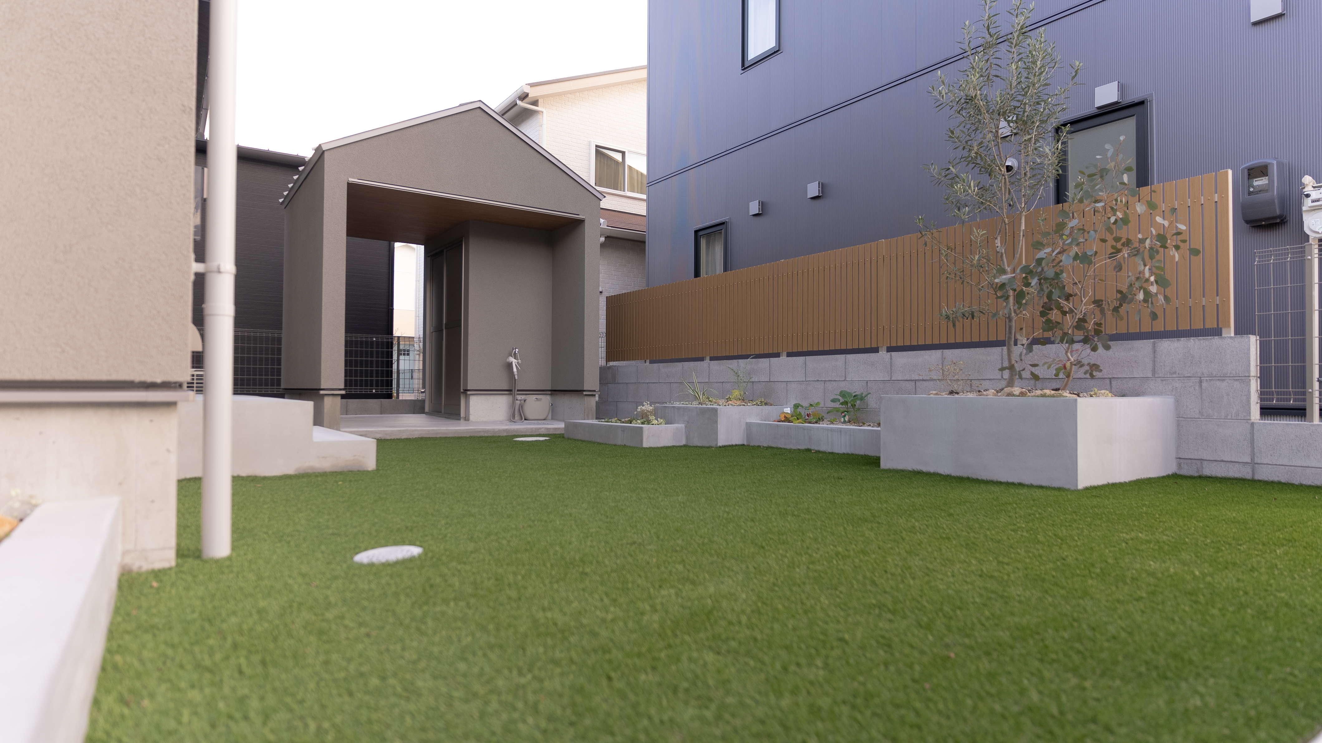 こちらは物置と駐輪スペースとなっています。一見、物置とは思えないオシャレな空間となっています✨